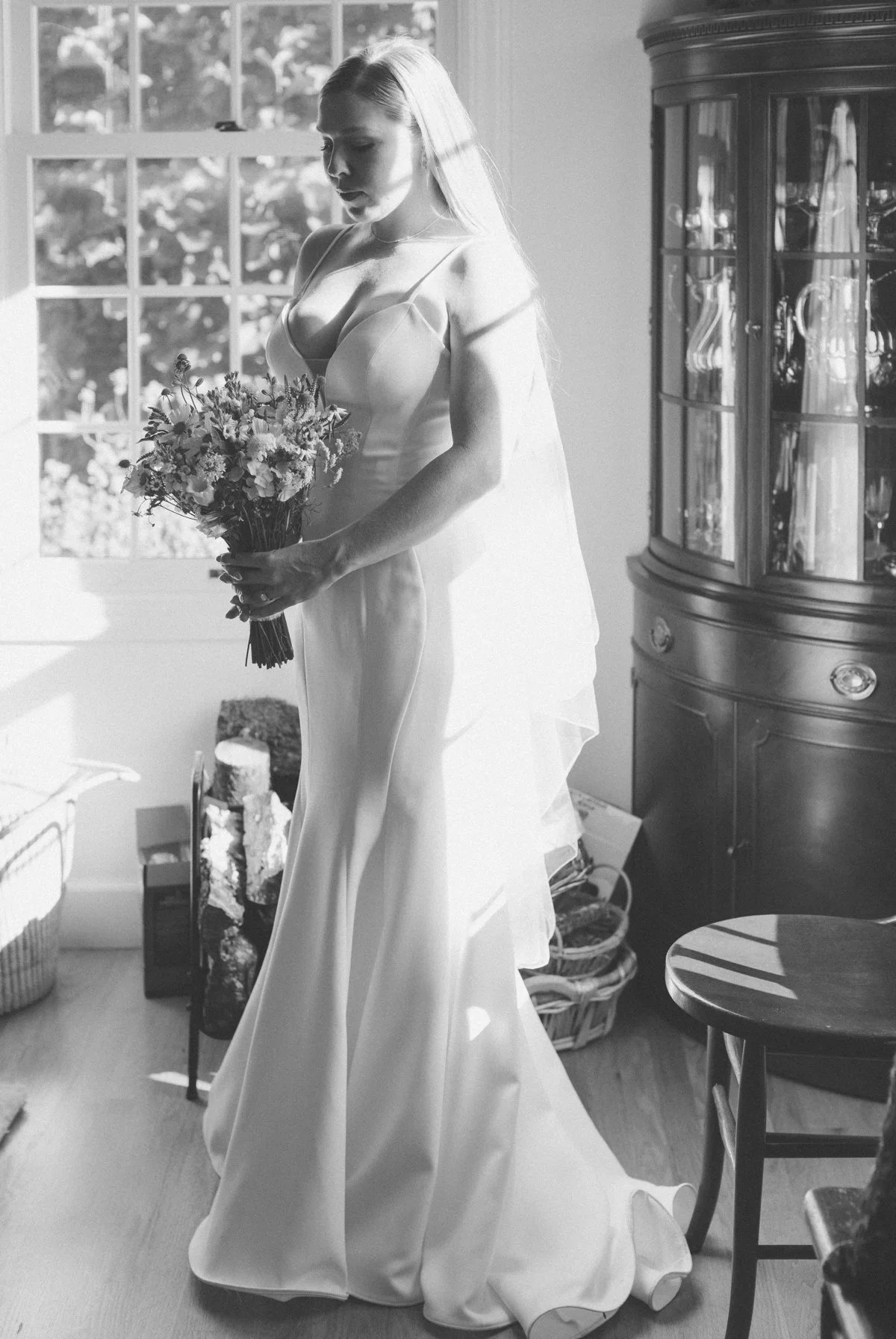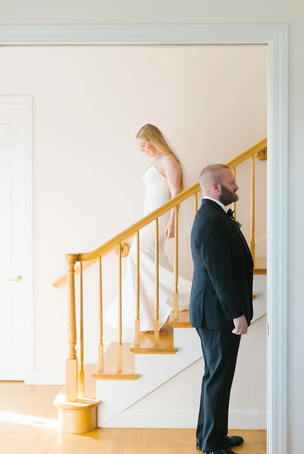 The main house served as a calm, welcoming home base for the day. It was there, at the foot of the staircase, that Heather and Andrew shared their First Look, a quiet, unhurried moment that beautifully captured their connection and personalities before the celebration began.
