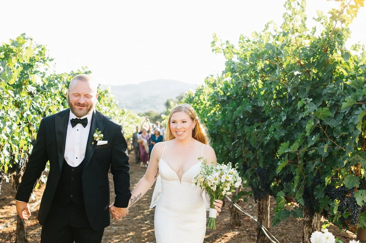 As the ceremony came to a close, late afternoon light filtered through the vineyard rows, and sun rays wrapped around Heather and Andrew as they walked together. It is the kind of golden natural light photographers hope for on days like this, and one of the many reasons I feel lucky to be a California wedding photographer.