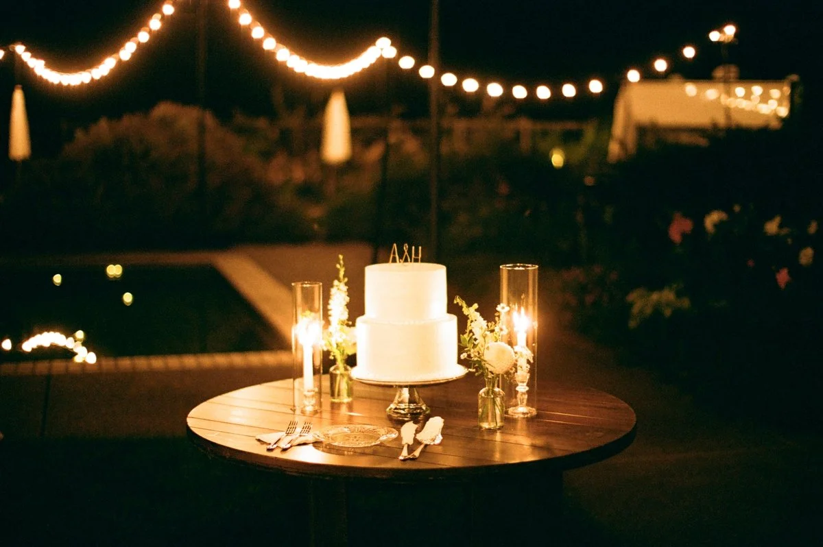 Later in the dinner reception, toasts followed from both mothers, a twin sister, and a best friend. As the sun disappeared behind the vineyard, string lights and candlelight transformed the space into a warm and inviting evening. One guest was totally surprised with a candlelit birthday cake, carried over by the couple, with thanks from them for sharing her birthday on their wedding day.